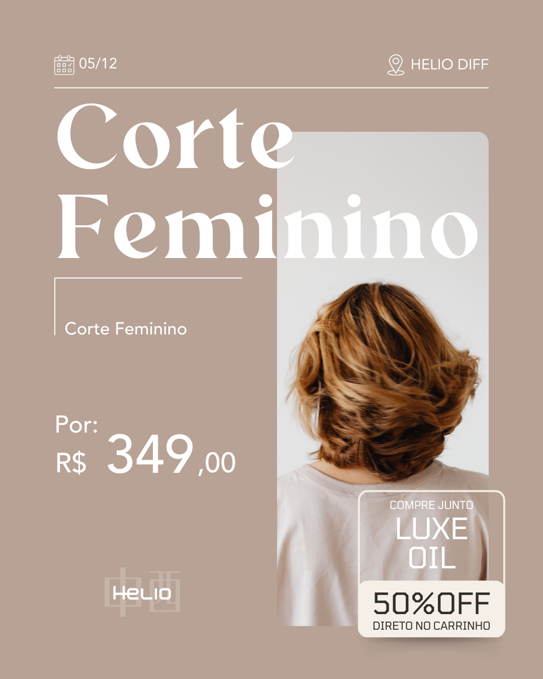 Na compra de um corte por R$ 349,00, você ganha 50% de desconto no Ritual Luxe Oil, aplicado automaticamente no carrinho.